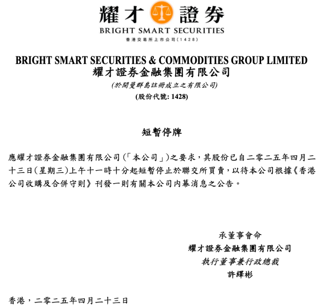 4月23日,耀才证券股价大幅上涨9.32%后停牌,股价收于3.05港元/股。随后,耀才证券宣布将发布内幕消息公告,因此自上午11时10分起停牌。