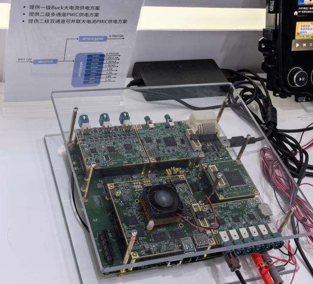 面向智能驾驶舱,MPS 参照设计方案展示了驾驶舱平台。现场工作人员介绍,本方案可提供一级 Buck 大电流供电方案,二级多路 PMIC 供电方案,二级双通道可并联大电流。 PMIC 供电方案。其中一级 Buck 可以采用大电流供电方案 MPQ4436 - AEC1 汽车级同步降压开关稳压器,二级多路 PMIC 选择供电方案 MPQ2177 - AEC1 等待汽车级开关稳压器系列。