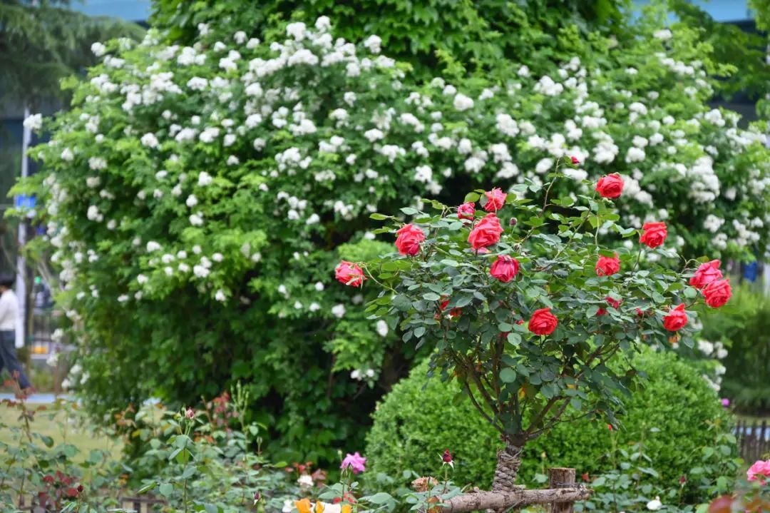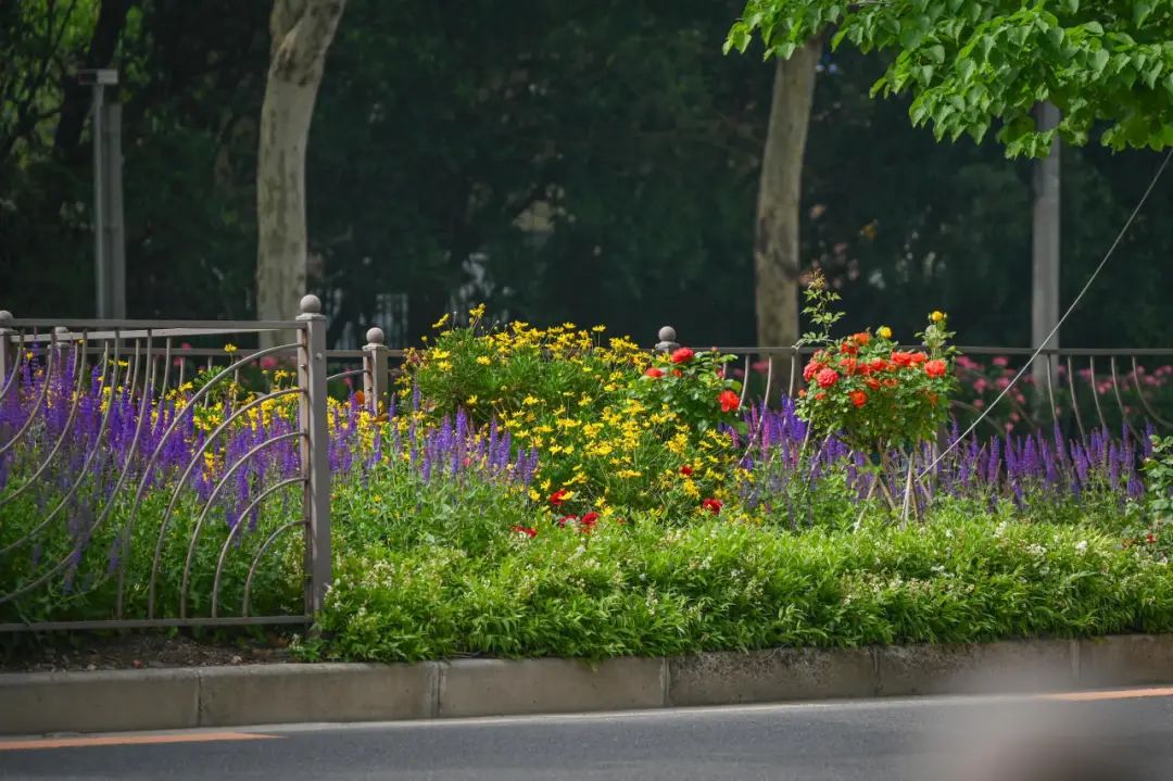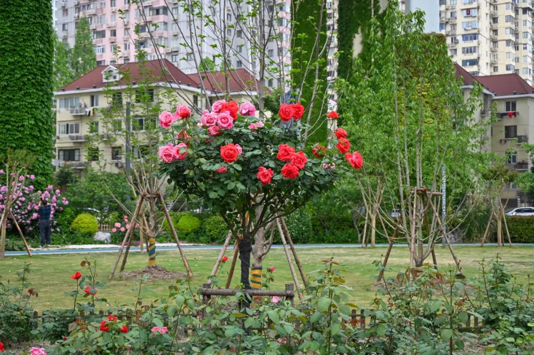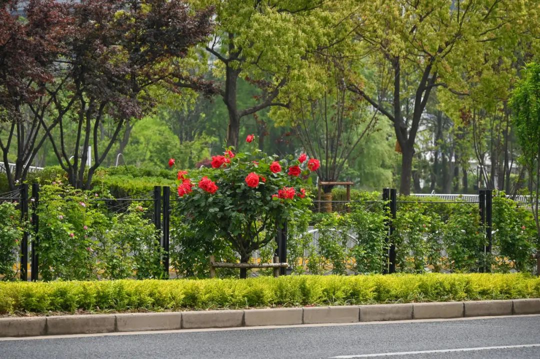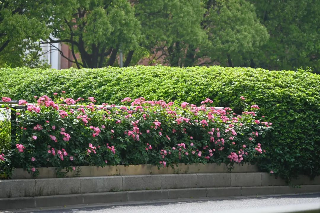 在延安西路、长宁路、虹桥路上,玫瑰巧妙地与城市家具融为一体。树状玫瑰、藤玫瑰、灌木玫瑰与沿途的历史建筑相得益彰。在这条路上开车,一路都是流动的风景。值得一提的是,延安西路去年被评为上海市绿化特色道路,今年开花的玫瑰景观让这条道路产生了全新的魅力。