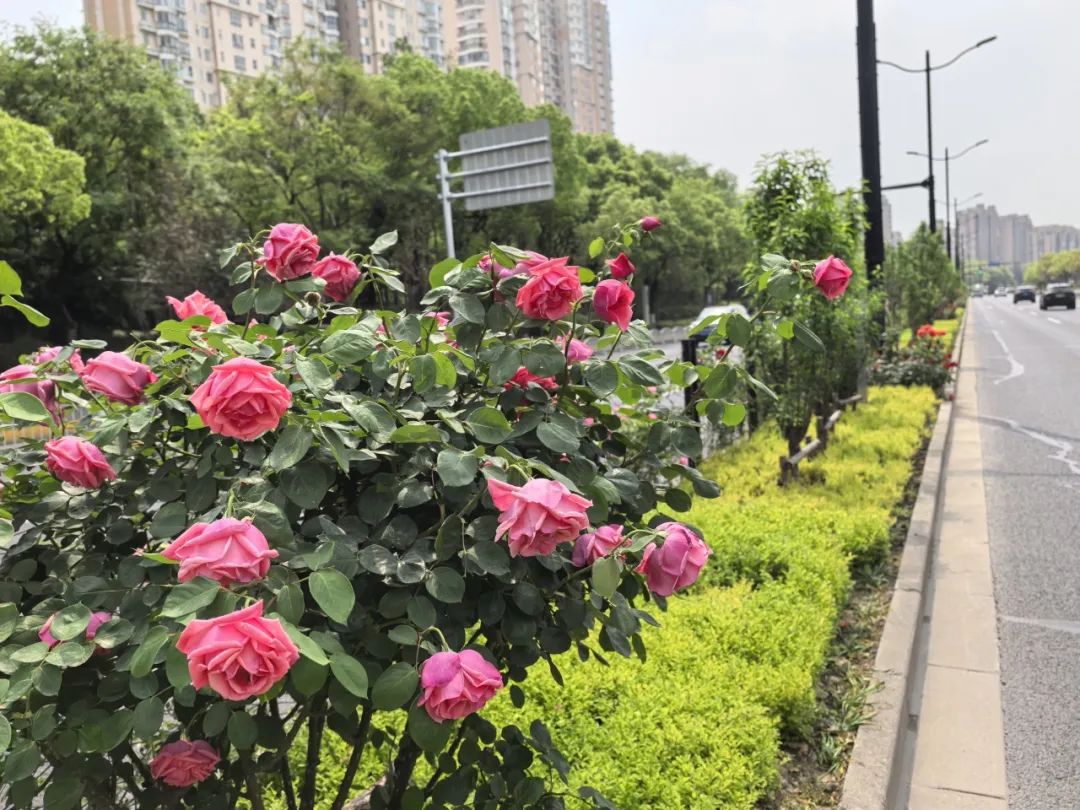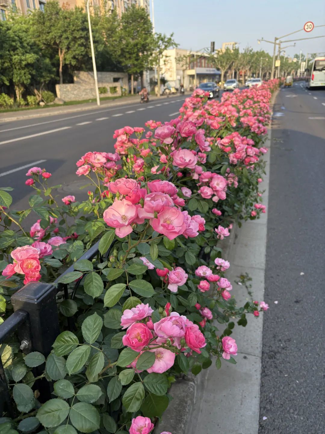 作为 仙霞西路此刻正被“上海市百条特色花道”所包围。 “安吉拉” 玫瑰染上了粉红色的云带。晨光中随风摇曳的花朵,层层花瓣在枝头绽放,娇艳的粉色花朵相互包围,沿着路面不断铺开,宛如绚丽的锦缎,为城市增添了一丝灵动的色彩。