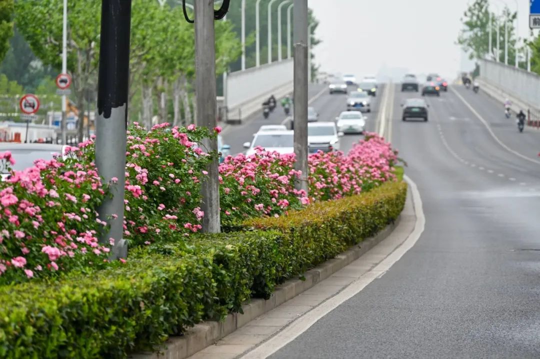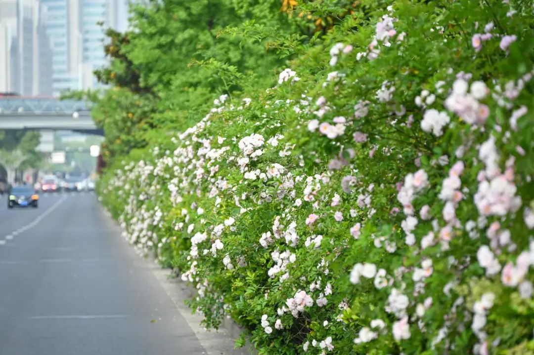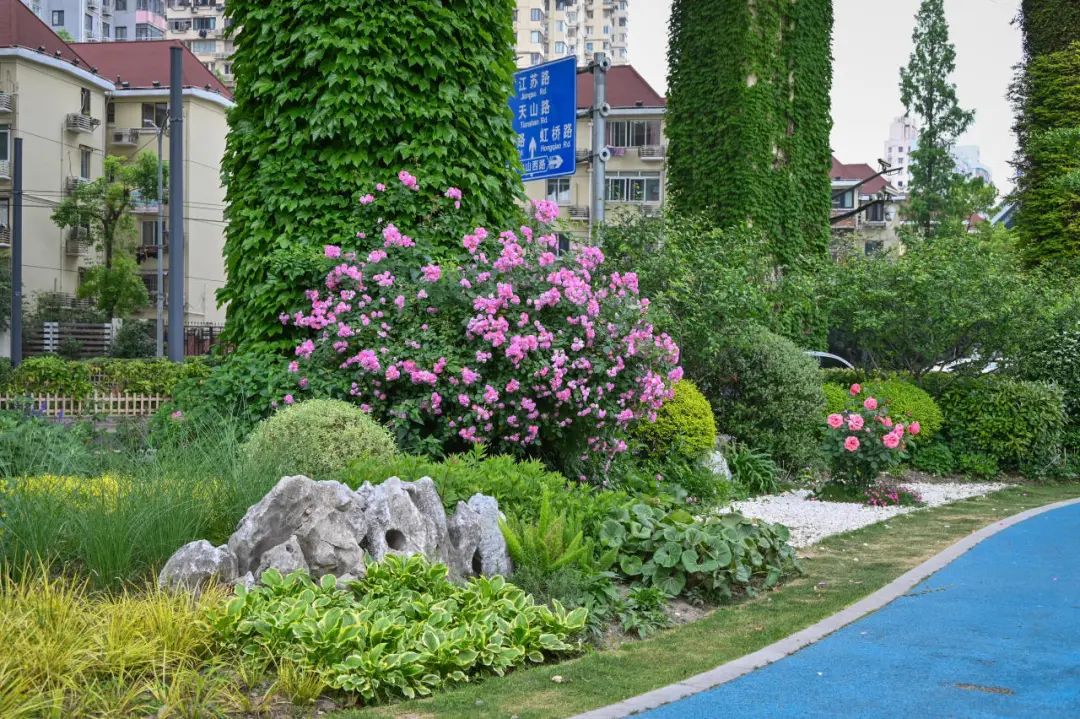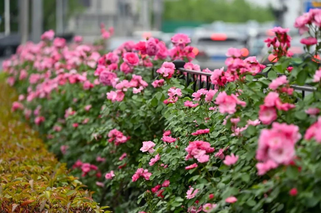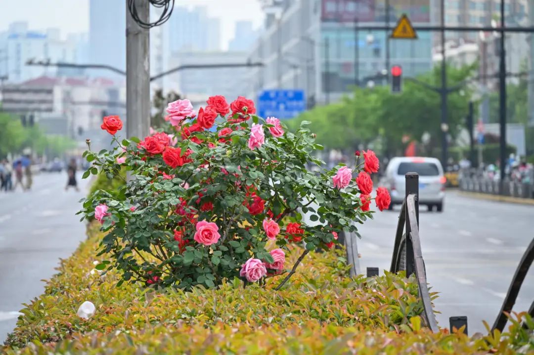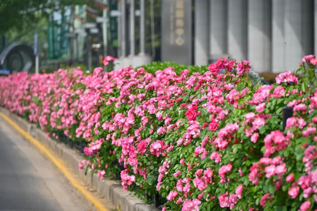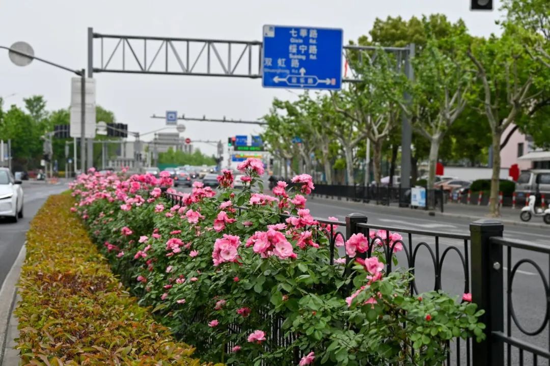 目前,长宁街正在出现一场流动的视觉盛宴。从连续数百米的仙霞西路粉色花墙,到与长宁路、延安西路、建筑一起跳舞的月季走廊,市民们在路上遇到了“花样浪漫”。
