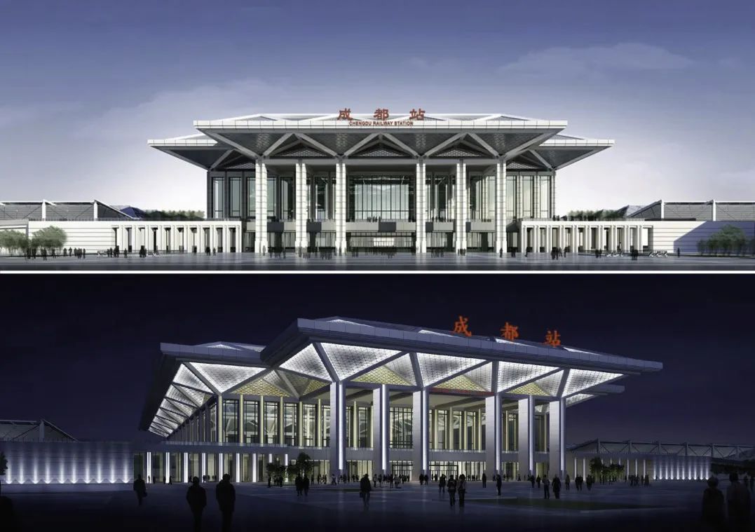 成都站建筑设计结合四川地域文化特色,以“竹编”和“蜀锦”线为元素,主体造型类似“城市门楼”。夜灯呈现出“孔明灯”的意境,呈现出传统与现代交融的独特风格。
