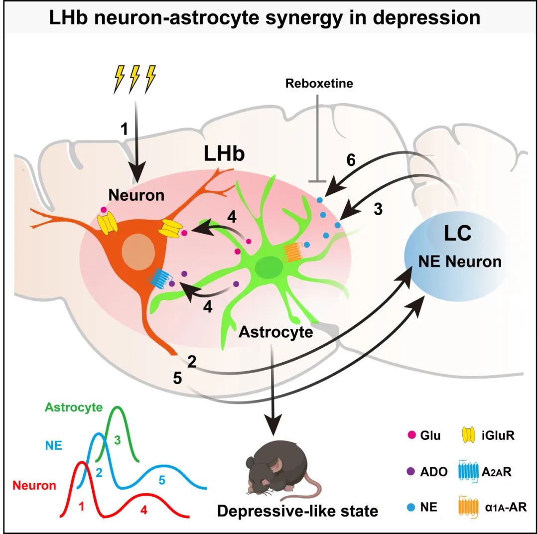 经过一系列的实验探索,压力在大脑中的传播路径逐渐完整,大脑深处的“压力电台”也暴露在水面上,这是神经元和星形胶质细胞之间独特的双向“对话”。:当压力来临时,LHb神经元首先“觉醒”,然后远程“唤醒”LC去甲肾上腺素神经元释放去甲肾上腺素。(NE);当NE到达LHb脑区时,在“对话”中激活LHb星形胶质细胞,释放胶质递质。这样就导致了LHb神经元的第二次长时间活跃。这样就引起了LHb神经元的第二次长期活动。-压力信号就像一把回旋镖,从LHb神经元到LHB脑区转了一圈,然后又回到LHb脑区,由星形胶质细胞传回到LHb神经元。