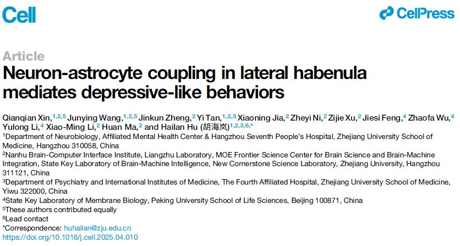 ︎ 浙江大学医学院胡海岚教授团队揭示了外缰核和蓝斑核在压力压力下的循环接力,以及神经元和星形胶质细胞的时序激活,传递压力信息,介绍抑郁症的发生,展示了不同细胞群体共同参与情绪编码的场景,从分子、细胞和神经环路水平上解释了“压力大”导致抑郁的原因。标题为“发表”Neuron-astrocyte Coupling in Lateral Habenula Mediates Depressive-like Behaviors"研究论文。作为通讯作者,胡海岚是浙江大学医学院博士生辛倩倩,王俊盈是第一位作者。