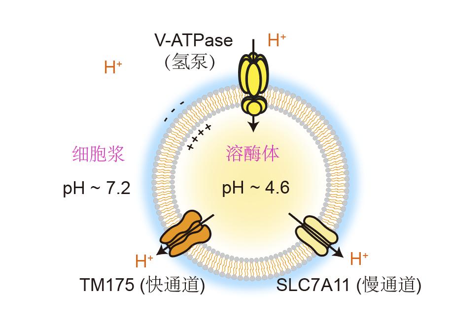 "SLC7A11介导的溶酶体慢速氢离子泄漏模式,结合我们之前发现的TMEM175介导的溶酶体快速氢离子释放模式,‘一慢一快’和氢离子泵V-ATPase构成了溶酶体酸碱调节的逻辑闭环."徐浩新说,这为团队的研究填补了一个空缺。
