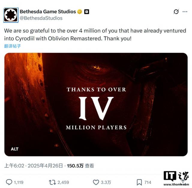 IT 世家 4 月 27 贝塞斯达宣布,“上古卷轴” IV:自从《湮没重制版》发布以来,玩家已经超过了。 400 万人。