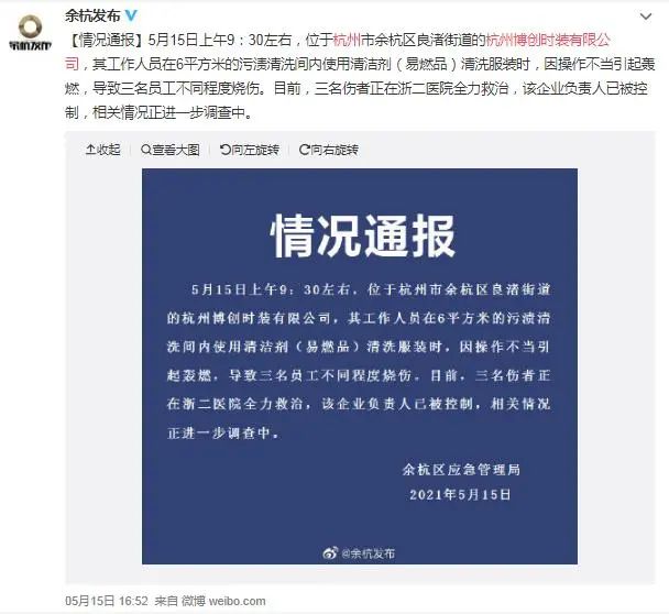 杭州市余杭区杭州博创时装有限公司2021年5月15日,其工作人员在6平方米污垢清洗室使用清洁剂(易燃物)清洗衣物时,由于操作不当,造成三名员工不同程度的烧伤。