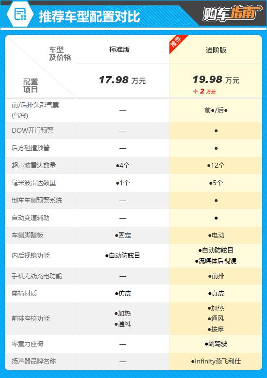 参考价为 19.98 高级版万元是本次推荐的车型。从配置对比可以看出,与入门级车型相比,推荐车型增强了之前的车型。 / 后排头部气囊 ( 气帘 ) 、DOW 开门预警和后方碰撞预警,进一步提高了安全性。此外,推荐车型的侧脚踏板升级为电动,可以有效提高上下车的便利性。此外,它还配备了皮革坐椅、前排座椅按摩功能和副驾驶零重力座椅,显著提高了乘坐舒适性。不仅如此,还增加了推荐车型。 Infinity 燕飞利仕,音质表现更好,更适合年轻消费者的使用需求。价格只比入门版多 20000 人民币,绝对物超所值。