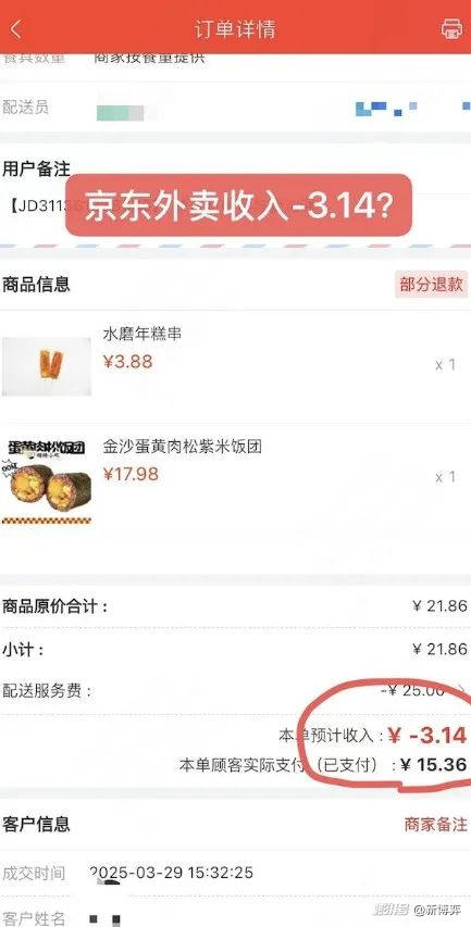 但事情可能没那么简单。有些商家怀疑自己在不知情的情况下被迫参加活动,导致“负收入订单”。商家结算界面的预计收入为-3.14元。