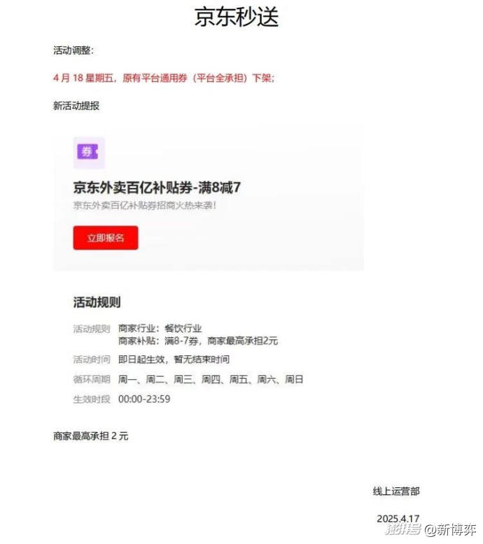 4月25日,据《重庆法治报》报道,JD.COM外卖再次调整“百亿补贴”政策,所有补贴活动都要求商家分摊50%的成本,这是活动上线12天来的第三次调整。