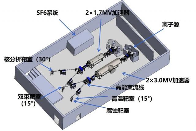 根据介绍,两台加速器的额度定端电压分别为 1.7MV 和 3.0MV,集成了 H、He 并且可以提供从喷射到喷射的负离子源 H、He 到 Au 大部分离子(稀有气体除外)。该设备具有“一机多用”、“两机共用”的特点,具有“双束辐照”的特点,具有“双束辐照”的特点。 高温 腐蚀性“多物理场耦合影响材料辐照特性研究能力,同时配备核分析靶室,可进行卢瑟福背散射和质子激励(通道) X 荧光分析。