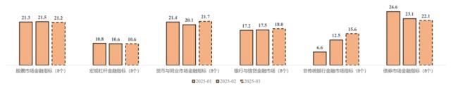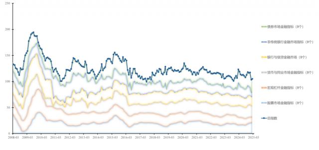 2025 年 3 月份,中国金融体系整体指数环比下降。 119.3 至 109.3,整体仍呈现下行压力,但同比持续增长,呈现复苏迹象。同时,市场继续呈现结构性分化:股市强劲反弹,风险偏好上升;债券市场、信贷和非银行金融体系明显萎缩,货币市场流动性收紧。总的来说,金融体系的韧性还在,风险总体可控。