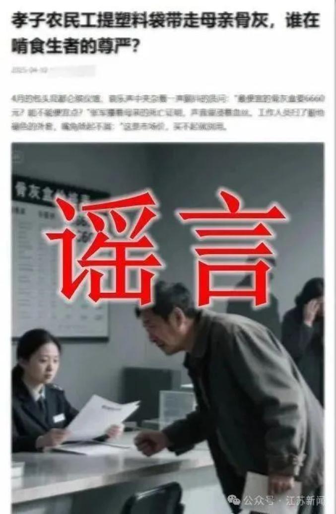 最近,网络平台上传播了一条“孝子农民工拿着塑料袋带走妈妈骨灰,谁在啃生者尊严”的虚假信息,引起了网友的关注和讨论。