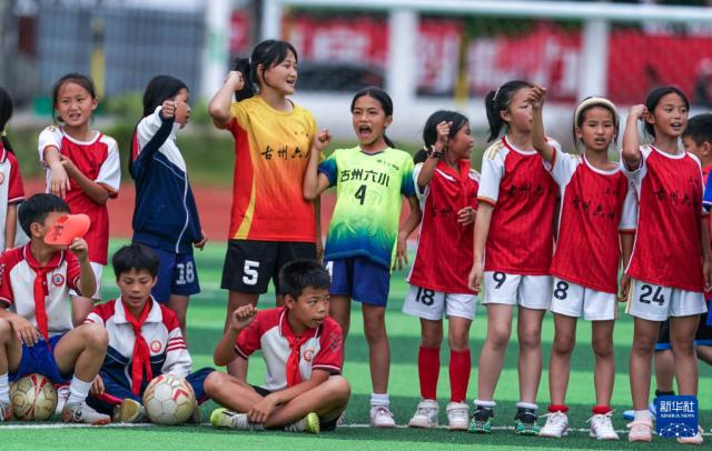 △ 4 月 25 日,在贵州省榕江县古州镇第六小学,学生们在观看“班超”足球比赛时为球员们加油。新华社(王炳真摄)