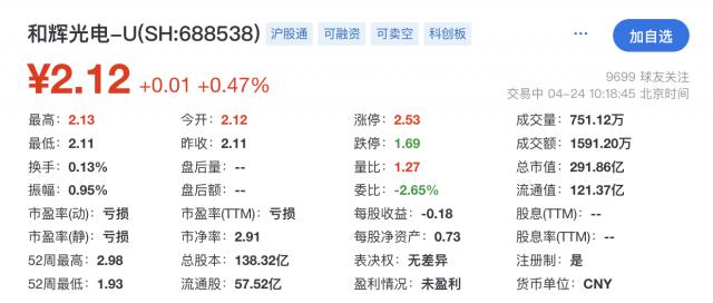截至发稿,和辉光电上涨。 0.47%,报 2.12 元,总市值为 291.86 亿元。