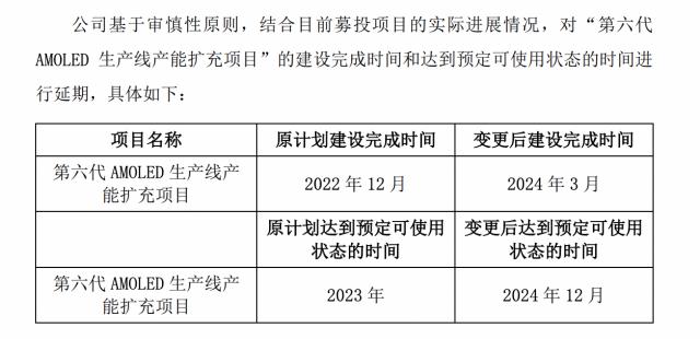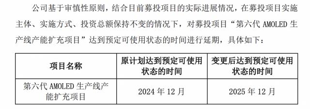 2024 年 10 月底,和辉光电再次宣布,公司在募集投资项目实施主体、实施方式、投资额保持不变的前提下,基于审慎原则,结合当前募集投资项目的实际进展,对募集投资项目进行了第六代 AMOLED 生产线生产能力扩展项目“达到预定使用状态的时间延长。从预定到可用状态的时间 2024 年 12 月延至 2025 年 12 月。