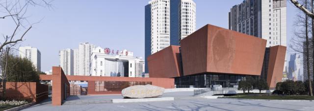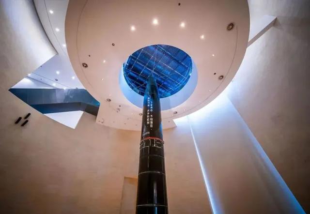 面向华山路的赭色外墙上若隐若现的学森笑脸。透过建筑开闭处的玻璃幕墙,从外面可以看到站在大厅里的导弹实体。