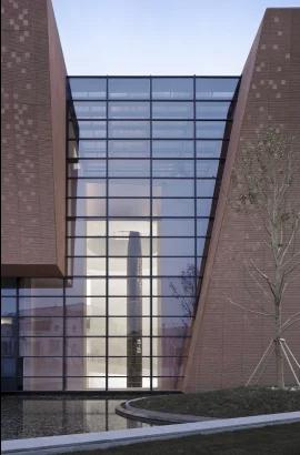 钱学森图书馆整体建筑采用“地面情怀,石破天惊”的设计理念。建筑外墙以红灰色为主,外观简洁端庄,远远望去就像戈壁滩上的风蚀岩。