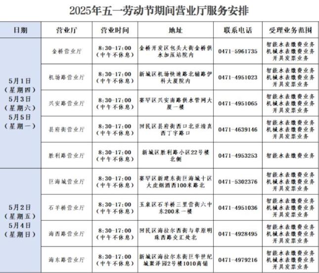 @呼市人 五一期间,这些服务部门的营业时间有所调整!
