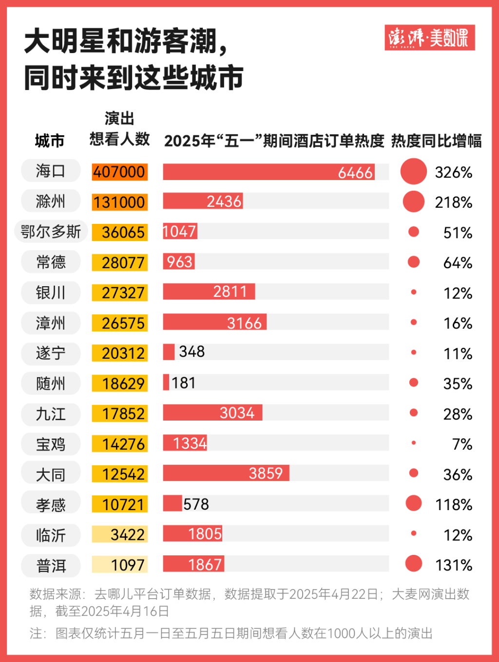 以滁州为例,邀请陈绮贞、黄贯中、安溥、赵露思等著名艺人参加音乐节。截至4月16日,大麦网上约有13万人想看这场演出。与2024年相比,滁州“五一”酒店订单的受欢迎程度增长了218%。