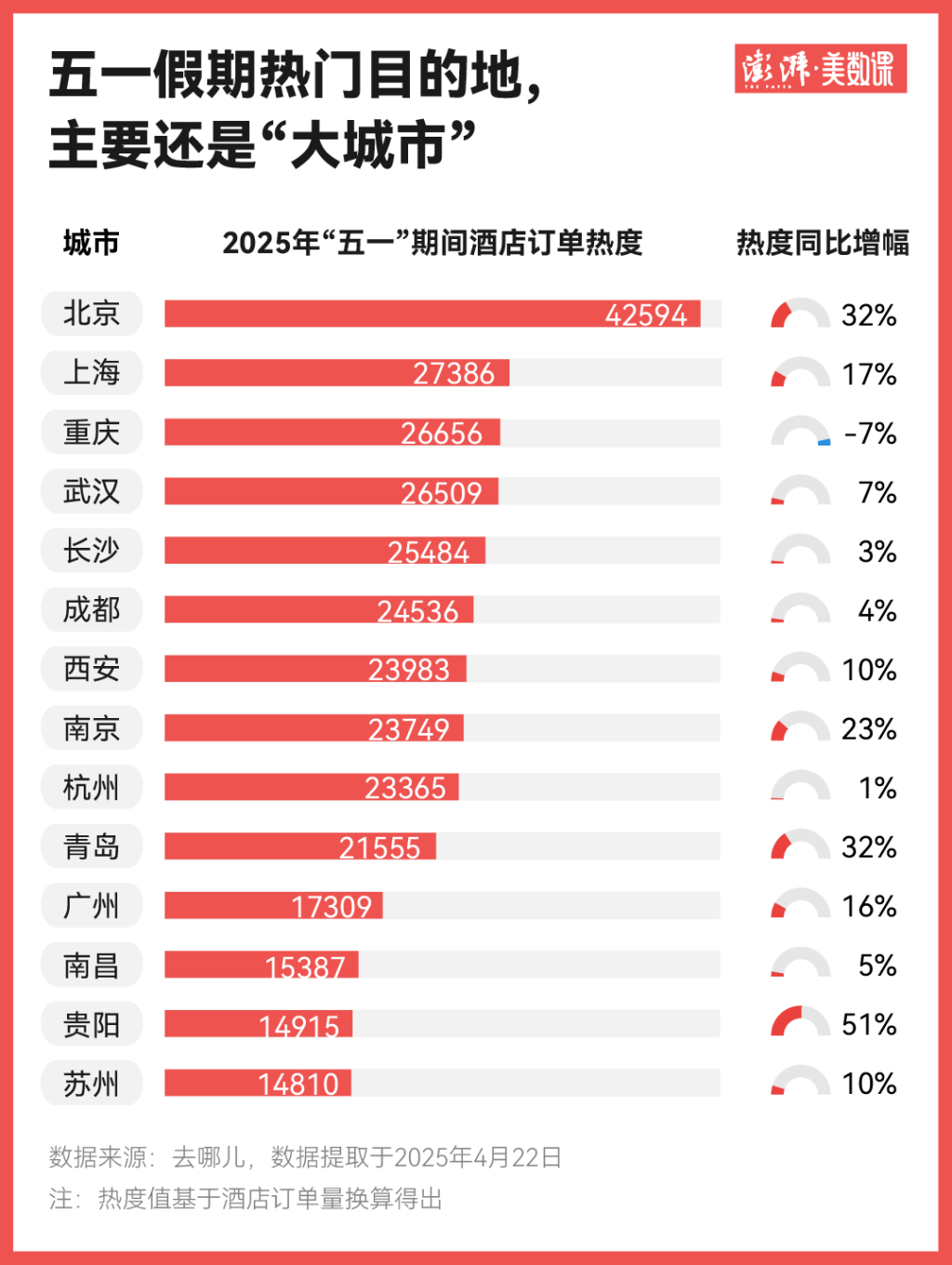四月二十二日去哪儿平台的数据显示,其他热门城市,如北京、上海、重庆、武汉,仍然是五一假期最重要的旅游目的地。,其中贵阳涨幅最大,与2024年“五一”假期相比,酒店订单热度增长51%。
