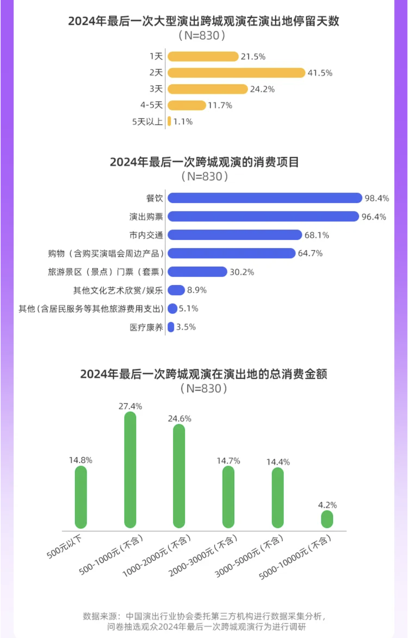 根据中国演出业协会的调查,近80%的观众参加了2024年跨城演唱会等大型演出,至少停留了2天,三分之一的消费超过了2000元。