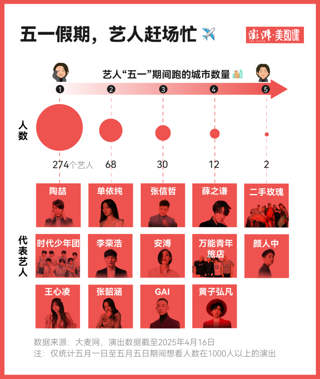 艺人们自然非常忙碌。平均每个人都要去参加五一假期的艺人, 1.5 座城市。凭借《乐队的夏天》走红的摇滚乐队二手玫瑰更是 5 天跑满 5 这座城市,航道漫长,最后一天从东部的江苏常州到中部的陕西宝鸡,几乎跨越了中国的一半。