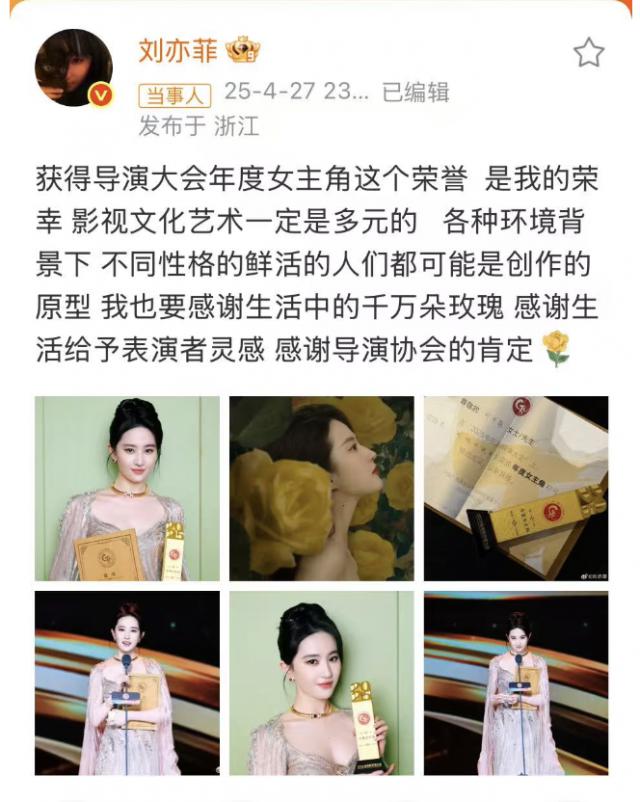刘亦菲:我很荣幸获得导演大会年度女主角的荣誉。影视媒体艺术必须多样化。在各种环境背景下,不同性格的新鲜人可能是创作的原型。我也想感谢生活中的成千上万朵玫瑰,感谢生活对表演者的启发,感谢导演协会的认可。