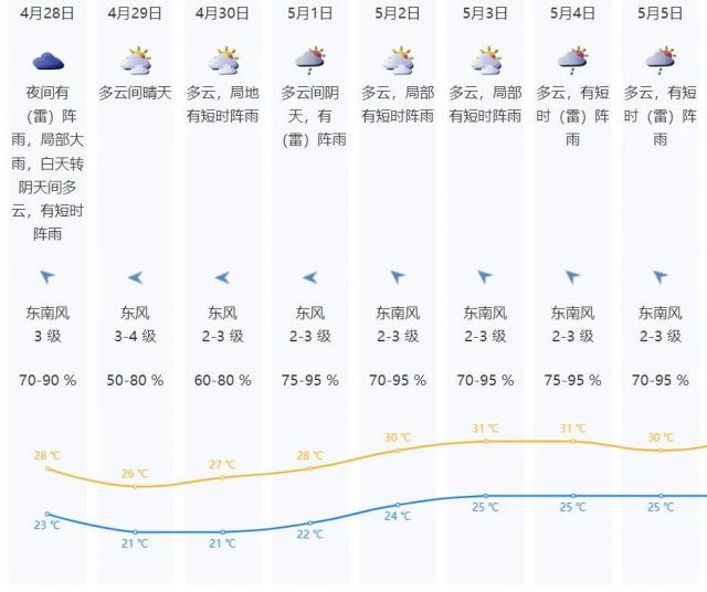 28 阳光明媚,阴天多云,有雷雨,局部可达暴雨,雨时伴有暴雨, 6-7 级别阵风,温度 23-28 ℃;