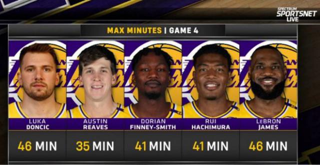 此外,詹姆斯、东契奇、里夫斯、芬尼和八村垒在雷迪克后半段加满了最后两节。结果,詹姆斯和东契奇都出现了。 46 分分钟,芬尼和八村垒都是 41 一分钟,里夫斯 35 分钟。