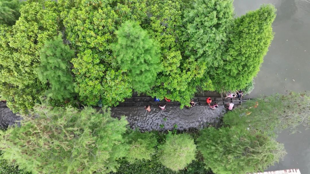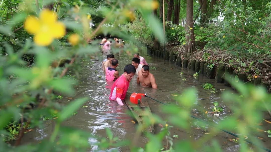 村民们在水中奋力推进