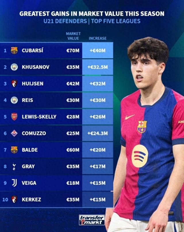 五大联赛 U21 本赛季后卫身家上升排名: