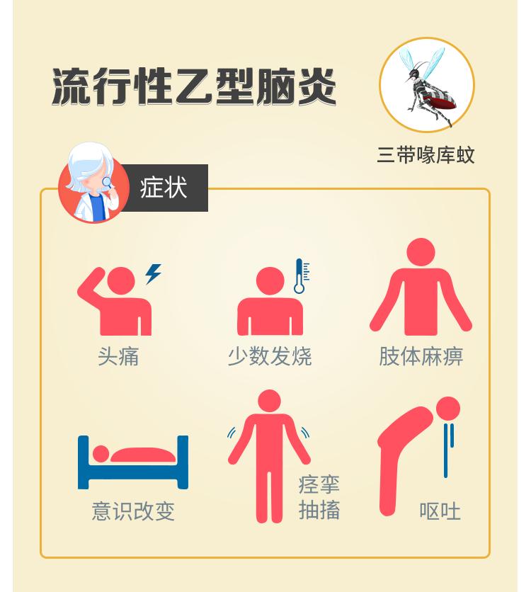 传播流行性乙型脑炎的三带喙库蚊(简称乙脑)。乙脑是一种由乙脑病毒引起的急性传染病,也是一种人畜共患疾病。人们普遍易感染乙脑病毒,感染后多数人无症状或症状较轻,少数人出现典型的乙脑病。潜伏期为4-14天,发病初期表现为急性脑炎,如发热、头痛、恶心、呕吐、嗜睡等。预防乙脑最有效的方法就是给适龄儿童接种乙脑疫苗。本市适龄儿童可在8月和2岁各免费接种1剂乙脑减毒活疫苗,成人进入疫区前可自愿、自愿接种乙脑疫苗。