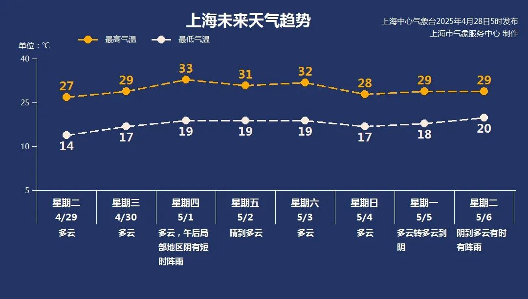 五月一日(星期四):阴天,下午部分地区有短时阵雨,19~33℃。