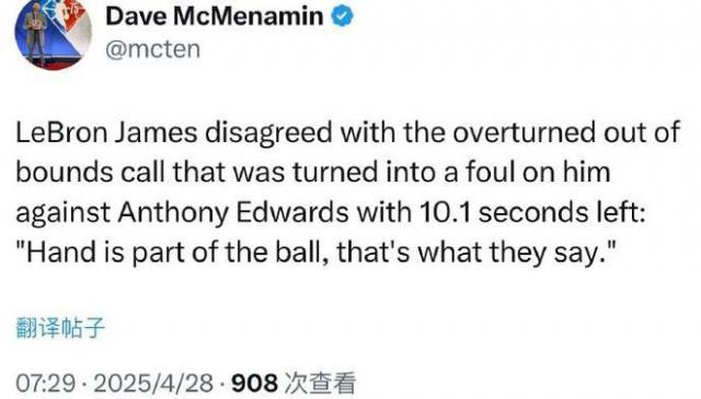 詹姆斯对最后一刻的吹罚表示不同意,他只是简单地回应:“手是球的一部分,这就是他们所说的。
