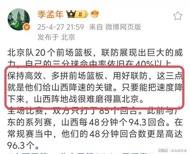 记者季孟年也和付政浩有同样的看法。“保持高效率,多争取前场篮板,利用好联防,是他们减速山西的关键。只要能降低速度,山西的阵地战就很难打赢北京。”。季孟年和付政浩,可惜英雄看到的都是一样的。