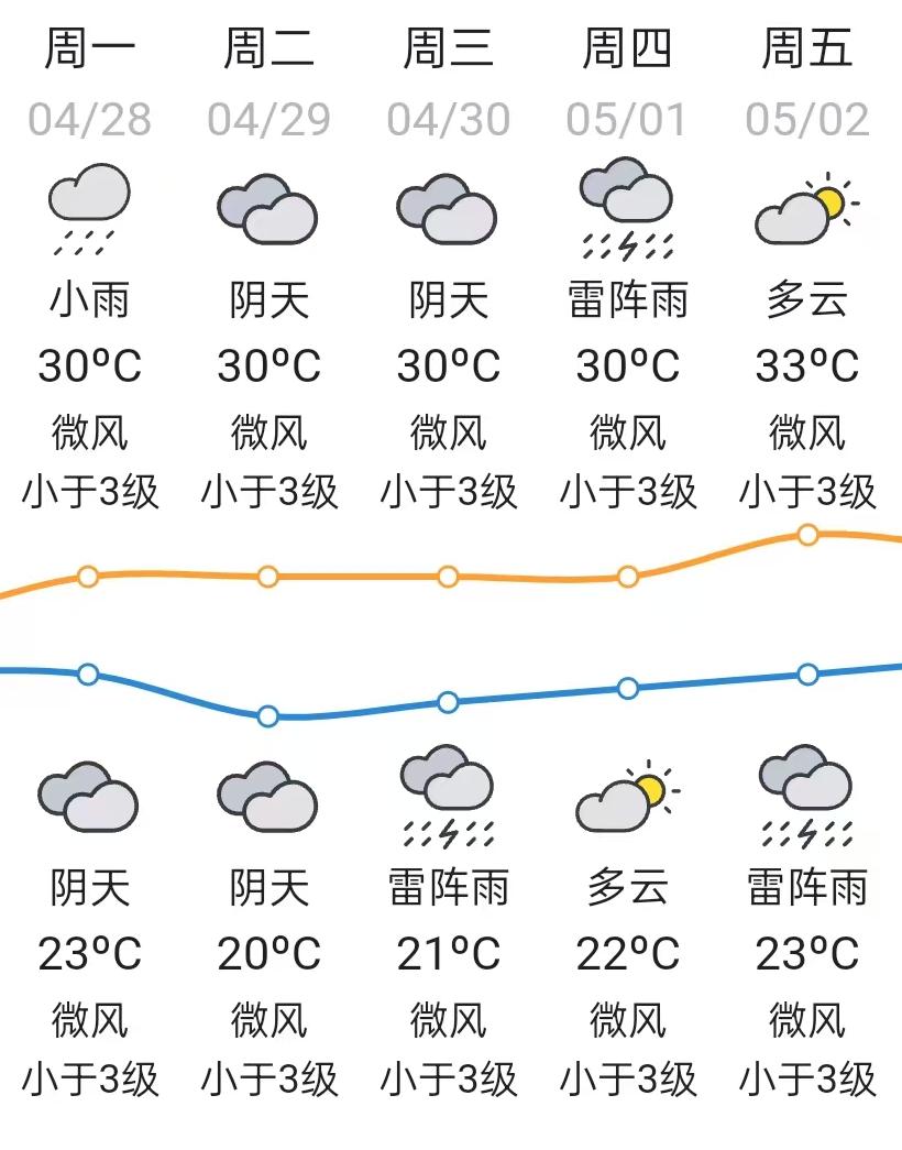 四月二十九日至三十日,以阴天为主的弱冷控制。