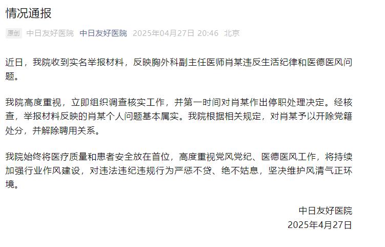 4月27日,中日友好医院发布情况报告:近日,医院收到实名举报材料,反映胸外科副主任医师肖某违反了生活纪律和医德。
