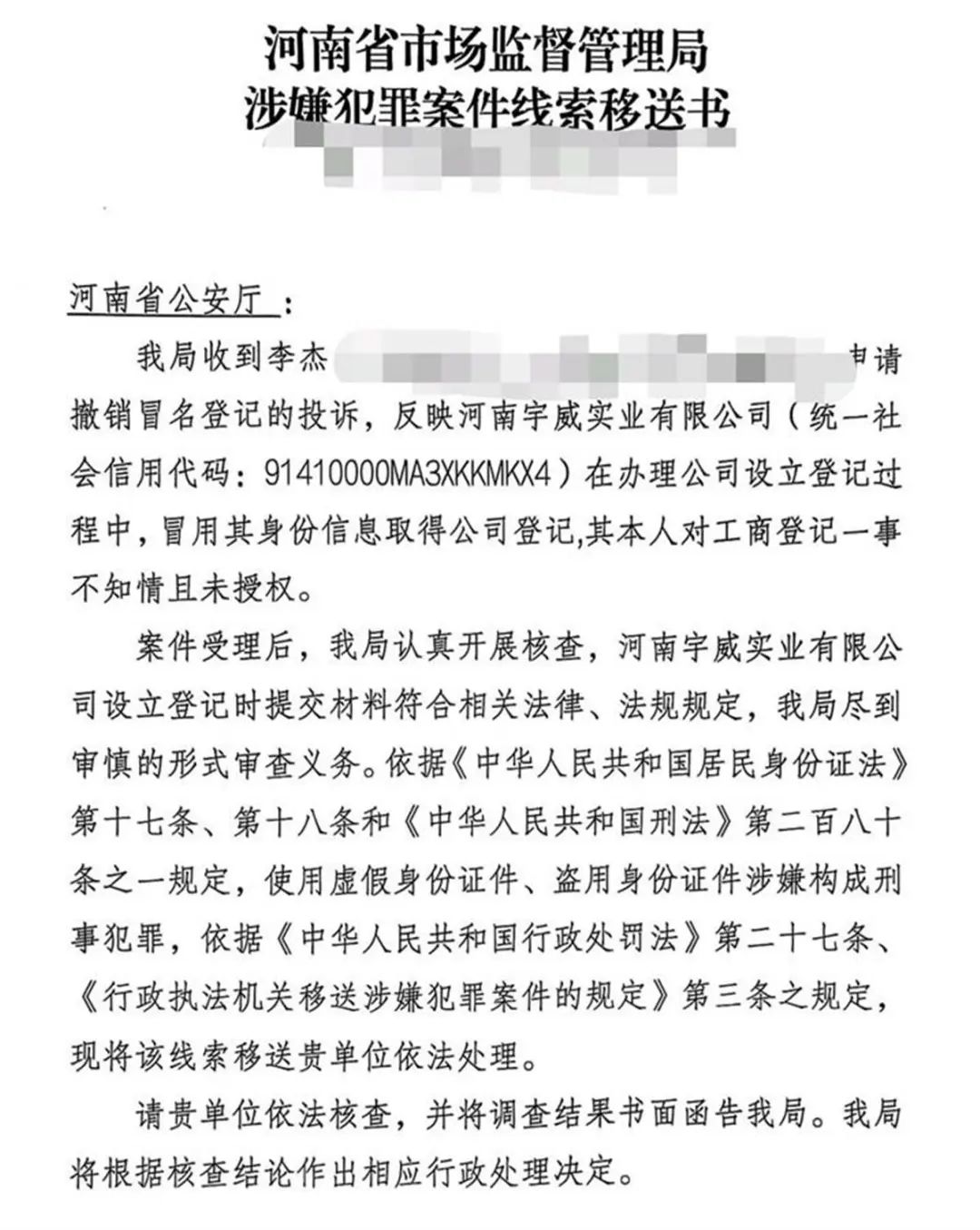 根据李杰提供的《河南省市场监督管理局涉嫌犯罪案件线索移送书》,河南省市场监督管理局收到李杰申请取消冒名登记的投诉,反映涉案公司在申请公司设立登记过程中冒用身份信息取得公司登记,不知道也不授权工商登记。
