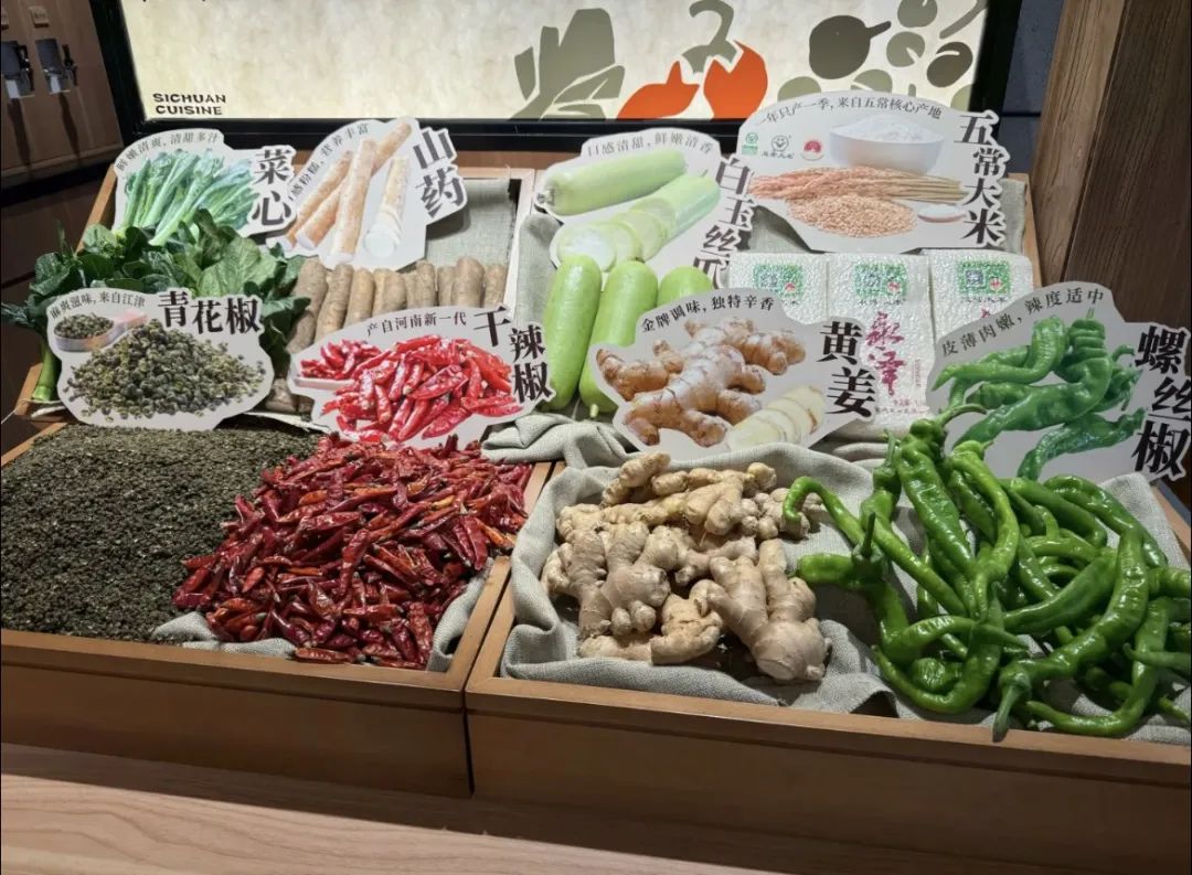 首先,在商店入口处增加一个配料展厅,展示时令配料,如白玉黄瓜、干辣椒、螺丝椒、菜心等,以强调配料的新鲜度。
