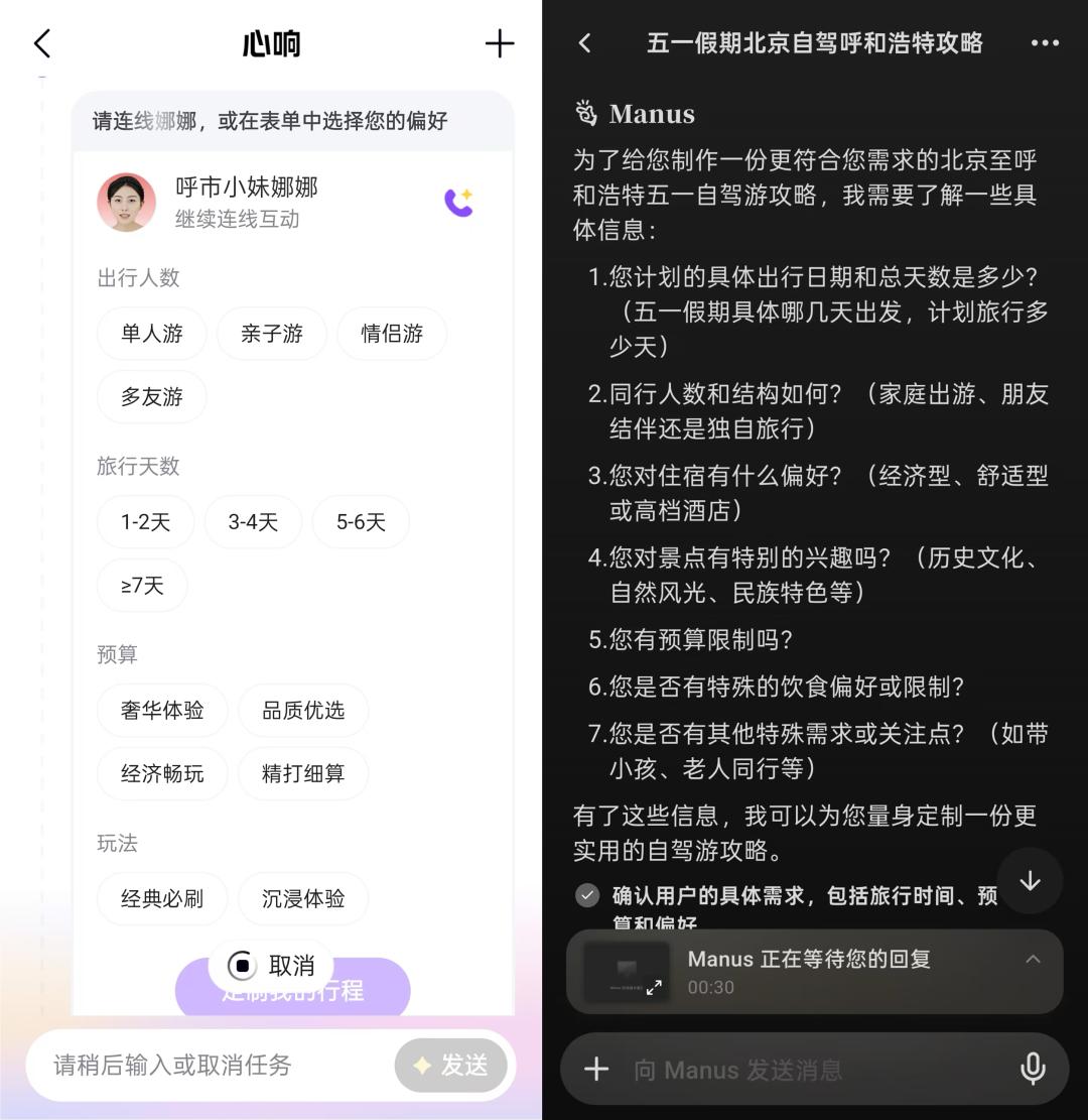 心跳App(左)、Manus(右)主动询问公路旅行的需求