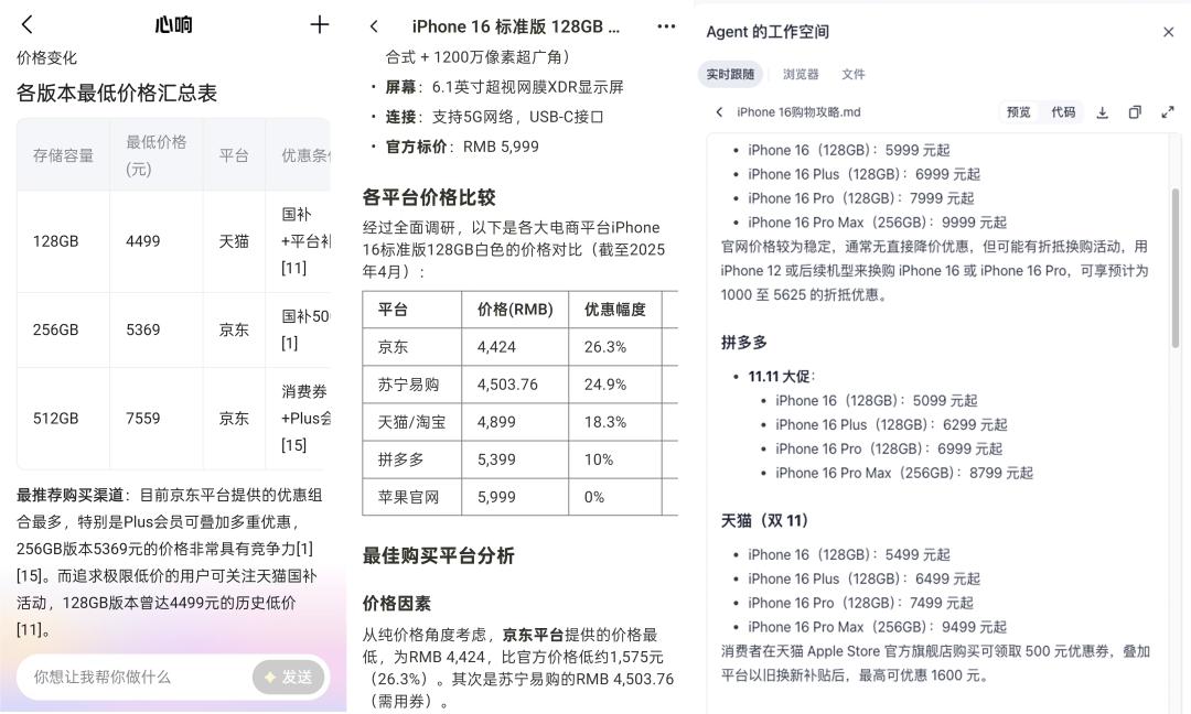 尽管三个通用AI智能体都给出了详细的iPhone。 16购买策略,但遗憾的是,这三个通用AI智能体提供的策略只有下单步骤有一定的参考价值,因为它们抓取的是互联网上过时的导购文章,而不是电商平台的实时价格和优惠促销。提供的iPhone 16价格都没有时效性。