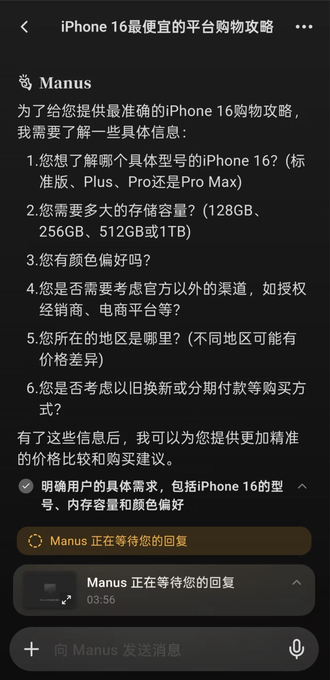 需要注意的是,由于没有明确具体的产品型号、设备和颜色,这个话题其实存在很大的歧义。我们的实际需求没有被询问,而是直接给出了iPhone。 每一个版本的价格。另一方面,Manus进一步询问了我们想购买的iPhone。 16型号,设备,颜色等信息。