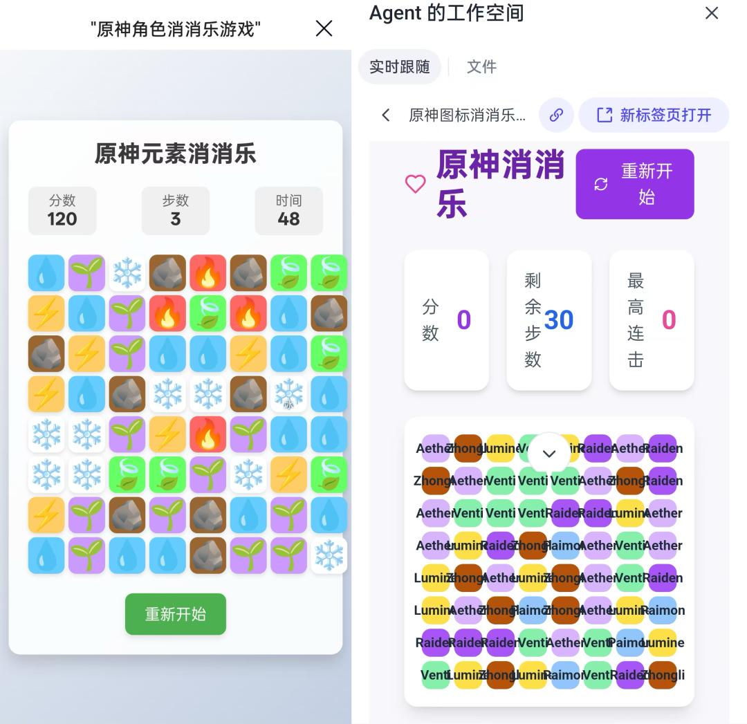 首先,针对通用AI智能体的编程能力,剁椒Spicy给三款产品下达了“做一款娱乐游戏,但图标要用原神的角色”的指令。