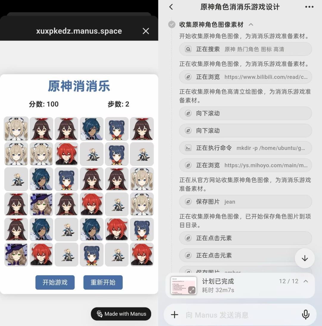 相比之下,虽然Manus运行这项任务需要32分钟,远高于心脏响应App和按钮空间,但最终产品相当惊艳。不仅玩法正确,游戏的图标都是原神的角色,甚至可以直接上架游戏店。