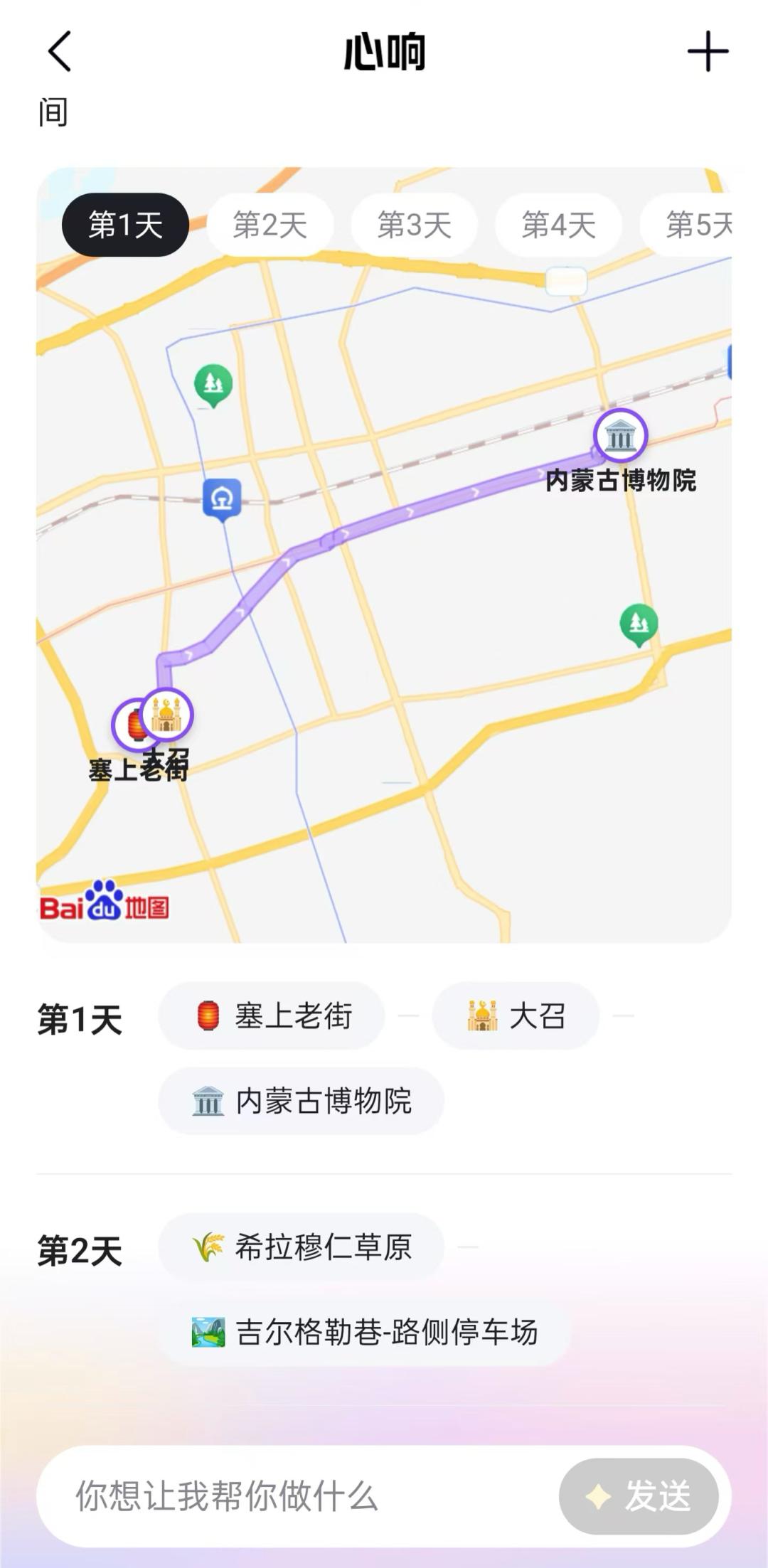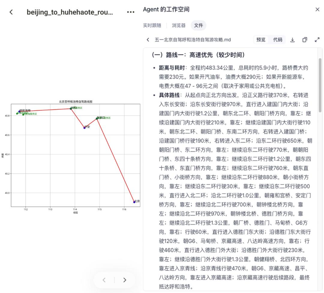 最后,剁椒Spicy还发布了“帮我做一个五一假期,北京到呼和浩特的公路旅行策略,需要包括路线图、住宿地点、景点规划、美食推荐”的指令,考察下三个通用AI智能体的规划和外部资源的获取能力。