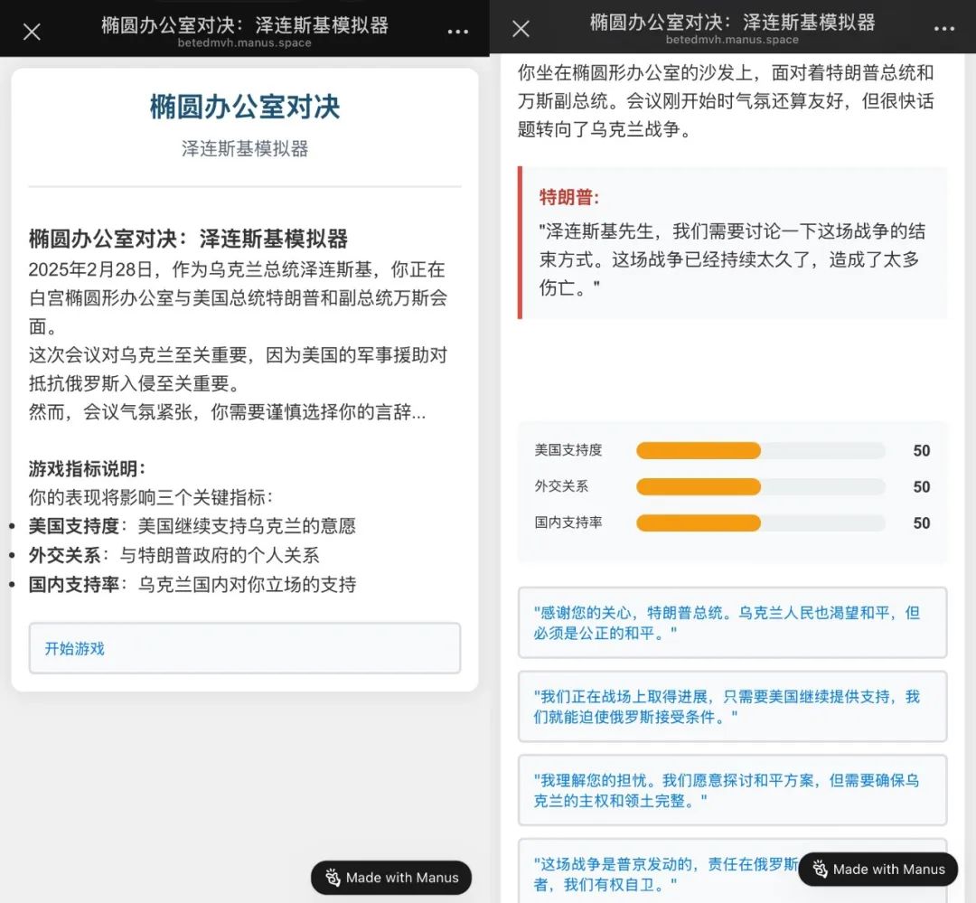 例如,一个椭圆办公室对战:泽连斯基模拟器,由Manus产生。(https://betedmvh.manus.space/)曾经在各大社区广为人知,并且成功地引发了AI游戏,甚至AI产品的新想象。