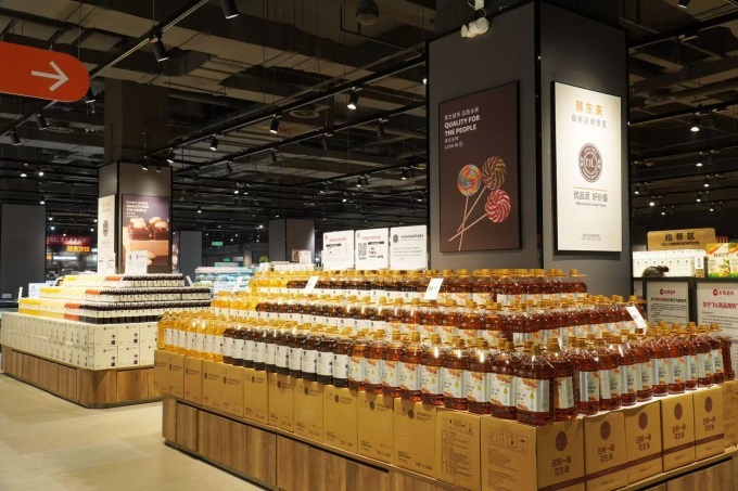 日韩泰港版可乐组成的“环游世界”展台吸引年轻人打卡。新推出的KOKA黑胡椒炒面、前一丁香油杯面等线上名人快餐,让90后上班族陈小姐装满了购物车:“这些之前要找采购的爆款,现在下班后可以顺便买到。而且最引人注目的应该是胖东来自有品牌专区。DL自酿啤酒、DL洗衣珠、DL食用油、DL洗衣液等口碑单品开业仅一小时备货。