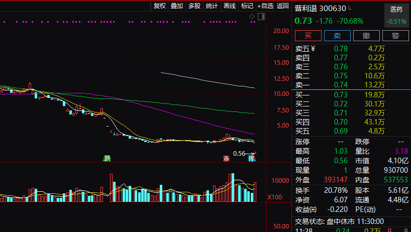 今天a股市场有一只股票进入了退市整理期,就是普利退市(普利制药,300630.SZ),这只股票早晨暴跌超过70%。