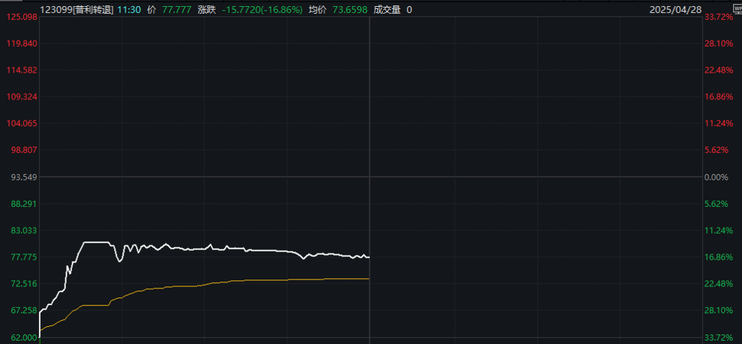 与此同时,普利制药发行的可转债今天上午也大幅下跌,盘中跌幅一度达到33.72%。目前,证券简称已经成为“普利转让”。